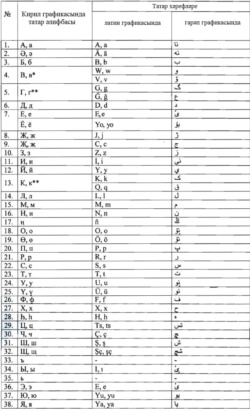 (**) Татар телендә "г" һәм "к" хәрефләре ике төрле авазны белдерү өчен кулланыла: йомшак "г", "к" һәм калын "гъ", "къ". Латин һәм гарәп графикасында һәр аваз өчен аерым хәреф кулланыла.