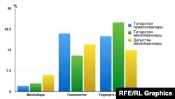 Сүрия сугышын Көнчыгыш белән Көнбатыш арасындагы каршылык дип күрүчеләр Татарстан урыслары арасында күбрәк. Әмма татарлар белән дагыстаннар арасында да Сүриядә геополитик каршылык яки ислам террорчыларына каршы сугыш баруын күрүчеләр мәзһәбара каршылык күрүчеләрдән күбрәк.