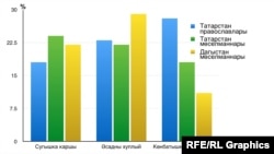 Татарстанда мөселманнарның 24 проценты, Дагыстанда 22 проценты гына Русиянең Сүрия сугышында катнашуына каршы булуын белдергән. Татарстандагы урыслар арасында исә андыйлар 18 процент, ягъни әлләни зур аерма күренми. Ул гына да түгел, Әсадка ярдәм итәргә кирәк дип исәпләүчеләр мөселманнар арасында күбрәк тә икән әле. Әсадка булышуны хуплаучылар Татарстандагы урыслар арасында 23 процент булса, Дагыстанданы мөселманнар арасында 29 процентка җитә.