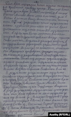 "Будда дине, коммунистик режим хакимлек иткән Кытайда да мөселманнар өчен телеканаллар эшли, башкала булган Пекинда җитмешләп мәчет бар. Мәскәүдә бары алты мәчет эшли. Русия мәгариф системасында яулыклар бәйләү тыела. Русия төбәкләрендә мәчетләр төзергә, мөселман зиратлары өчен җирләр бирүдә даими каршылыклар күрсәтеп, проблемнар тудыралар. Мәхкәмәләр мөселман китапларын юк итү турында карарлар чыгара. Төрле сәбәпләр табып мәхкәмәләр мөселманнарга карата ялган эшләр ача, аларны төрмәләргә утырта. Шушындый басымнар нәтиҗәсендә меңәрчә кеше чит илләргә китәргә мәҗбүр, кайберләре “Ислам дәүләте” өчен сугыша. ФСБ башлыгы Александр Бортниковның Сүриядән, Әфганстан һәм Гыйрактан кайткан өч меңләп сугышчының Русиягә куркыныч тудыруы турындагы сүзләрен “Российская газета” яза. Күрәбез, көч структуралары басымы бары тискәре нәтиҗәләр генә бирә. Хакимиятләргә Русиядәге 25 миллион мөселманның проблемнарын чишү зарур. Алар үзләрен чын ватандашлар итеп хис итәргә тиеш” диелә Путин исеменә язылган хатта.
