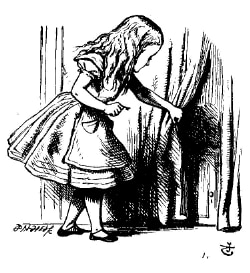 Кинәт кенә ул өч аяклы кечкенә генә пыяла өстәлне күреп алды, анда бер нәни алтын ачкычтан кала берни дә юк иде. Алисәнең башына килгән беренче фикере, әлбәттә, бу ачкычның бүлмәдәге кайсы да булса ишеккә туры килүе турында булды, әмма, нинди бәла! Йә йозаклар артык зур, йә ачкыч артык кечкенә булып чыкты, һәрхәлдә, аларның берсен дә ачып булмады. Шулай да, икенче тапкыр ишекләрне тикшерә башлагач, ул башта игътибар иткән пәрдәне күреп алды, аның артында биеклеге 15 дюймнан да артмаган кечкенә ишек иде. Ул аны кечкнә алтын ачкыч белән ачып карады һәм, бәхеткә, ул туры килде!