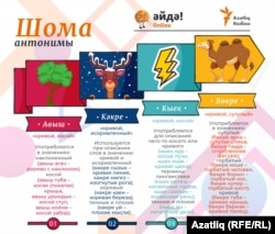 Много слов в татарском можно выразить разными способами, ведь наш язык очень богат на синонимы. В рамках рубрики "Синонимы и антонимы в татарском" мы учимся, как ещё по-другому можно сказать то или иное слово, описать событие. Мы подробно разбираем, когда и как лучше использовать конкретный синоним или антоним.
