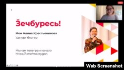 Конференция икенче блогер чыгышы белән тәмамланды - Алина Крестьянинова кайчандыр Tumblr платформасындагы блогында удмурт интерфейсы булдыруын, хәзер Telegram платформасына күчүен сөйләде. "Блогны башлагач, үземә "Удмурт телендә яз!" дип максат куйдым да, удмурт телендә язарга тиешлегемне исемдә тотам”, ди ул.