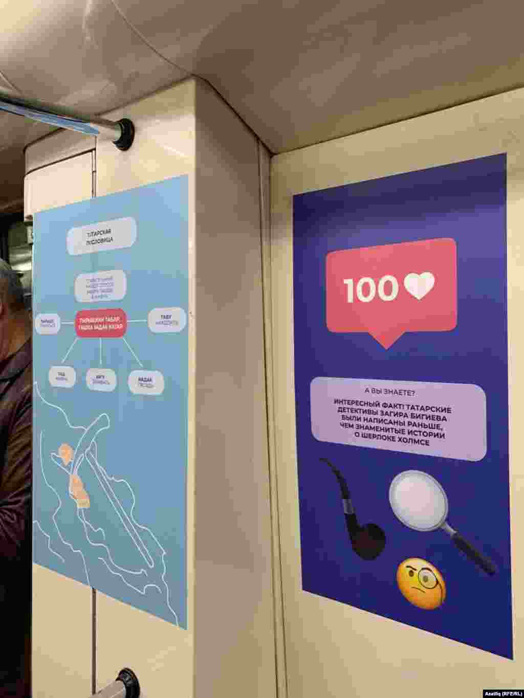 Мисал өчен татар теленә багышланган вагонда урысча-татарча иң кирәкле сүзләр сөйләүлеге, татар әдәбияты турында кызыклы фактлар, юмор белән татар телендә озын сүзләрне кабатлау тәкъдиме, тизәйткечләр, мәкальләр, "татар телендә аралашучыларга 100 лайк" кебек плакатлар эленгән.