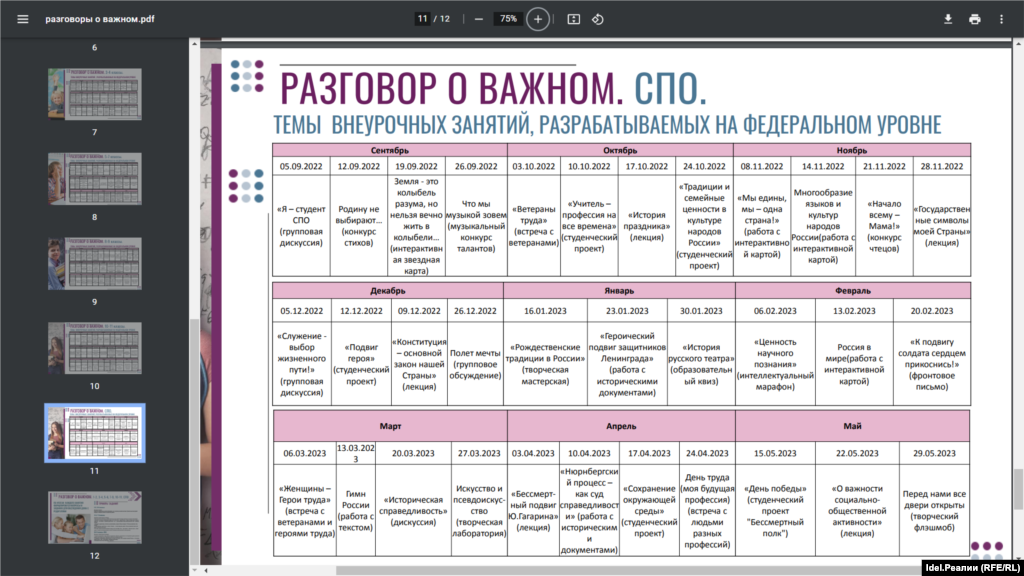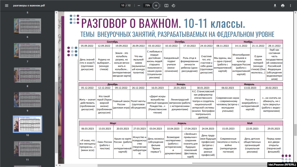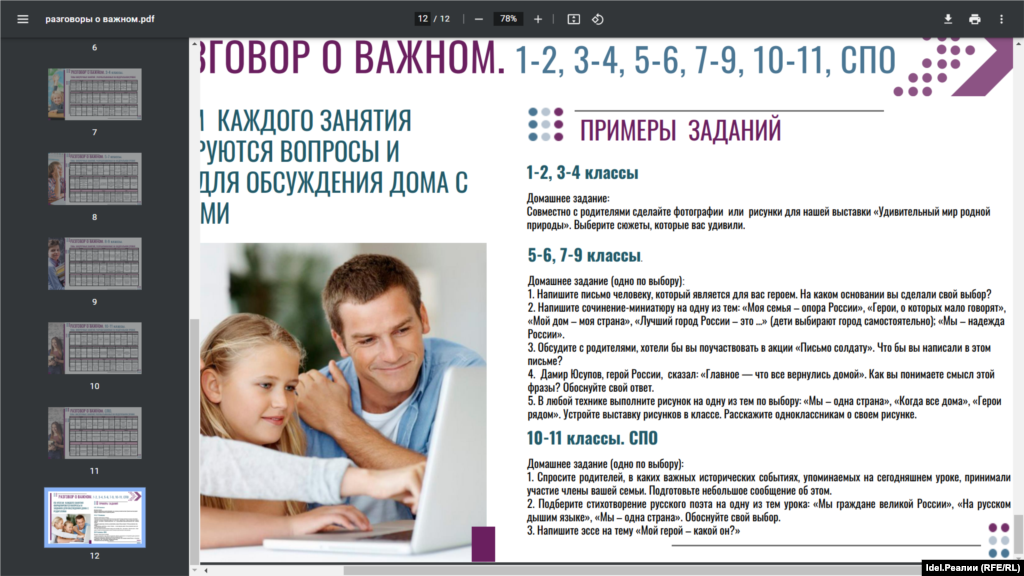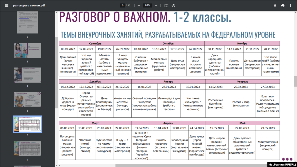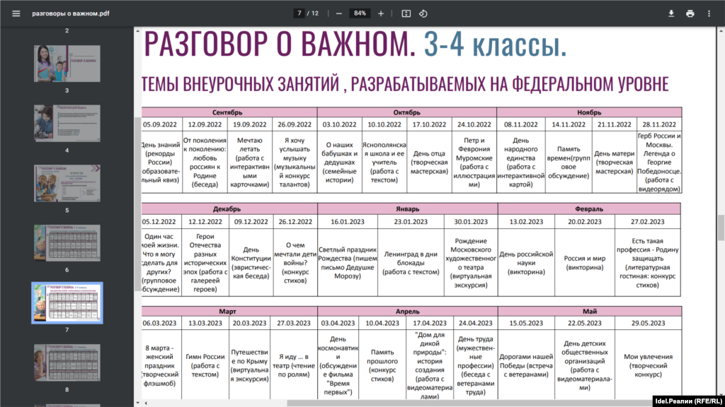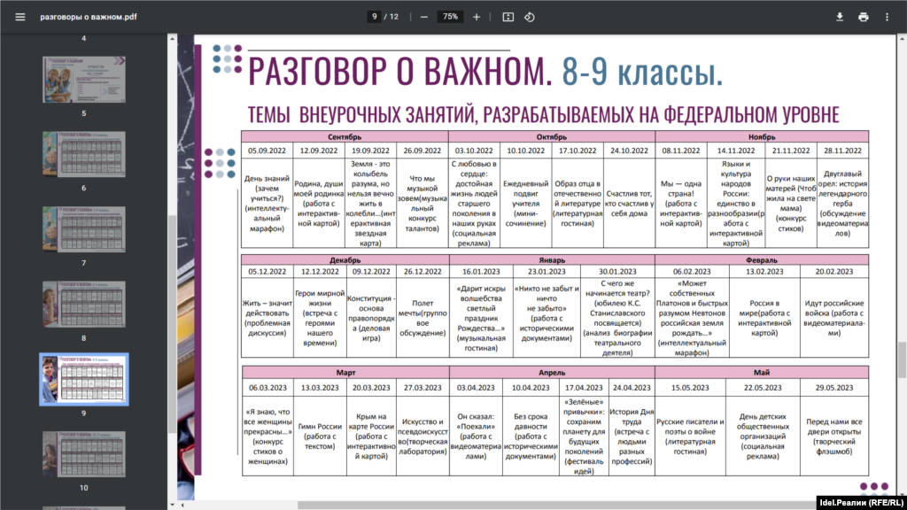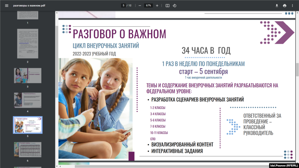 2022 елның 1 сентябреннән Русиянең барлык мәктәпләрендә "дәрестән тыш эшчәнлек кысаларында" яңа факультатив курс кертелә. "Мөһим әйбер турында сөйләшүләр" дип аталган бер елга сузылган курс "патриотик, әхлакый һәм экологик юнәлештәге" дәресләр циклы дип тасвирлана. Русиянең Мәгариф һәм фән министрлыгы хәзер аның кулланмасын барлык төбәкләргә тарата. Яңа кулланмада экология әллә ни күп түгел, аның каравы "патриотизм" һәм "әхлаклылык" төшенчәләре тулып ята.